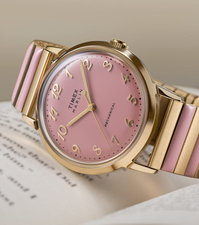 This watch offers a 34mm stainless-steel case that is both simple and elegant, providing the perfect frame for a pink dial featuring gold-tone Breguet numeral markers. The mechanical movement and domed acrylic crystal pay homage to classic watch styles of the past. Meanwhile, the Perfect Fit™ expansion band with alternating pink and gold-tone links can be sized perfectly to your wrist, no tools or jeweler necessary.Specifications