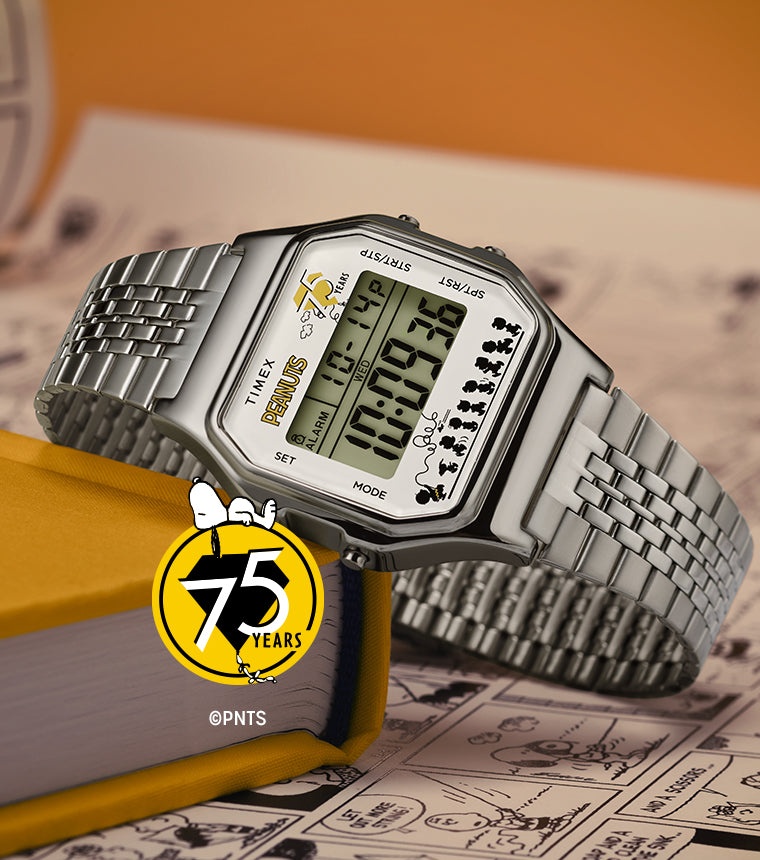 Celebrate 75 years of joy with our special Timex x Peanuts® watch collection, a heartfelt tribute to the imaginative genius of Charles Schulz. Designed for Peanuts fans of all ages, this playful iteration of our Timex T80 captures the fun and whimsy of the Peanuts gang on its lens, complete with a kite bearing the Peanuts 75th anniversary logo. We’ve paired its charming design with a sleek 34mm case, a stainless-steel bracelet, and a customized case back engraved with the Peanuts 75th anniversary logo.Specifications