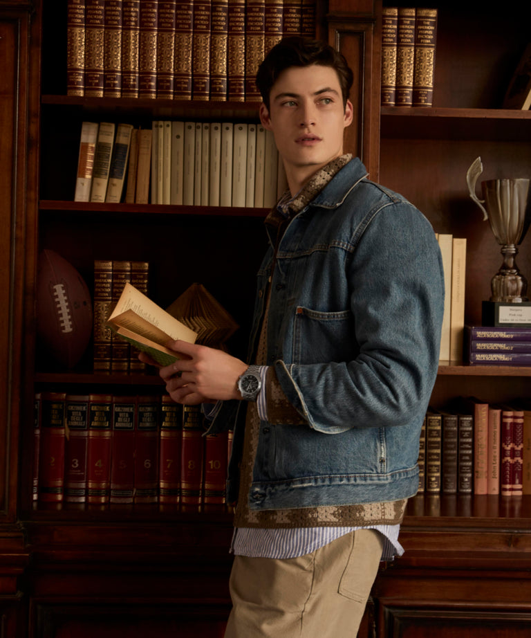 A man lounges comfortably on a beige couch in a library, smiling while showing off a Timex chronograph watch. He wears a denim jacket layered over a patterned sweater, embodying relaxed luxury and timeless style.
