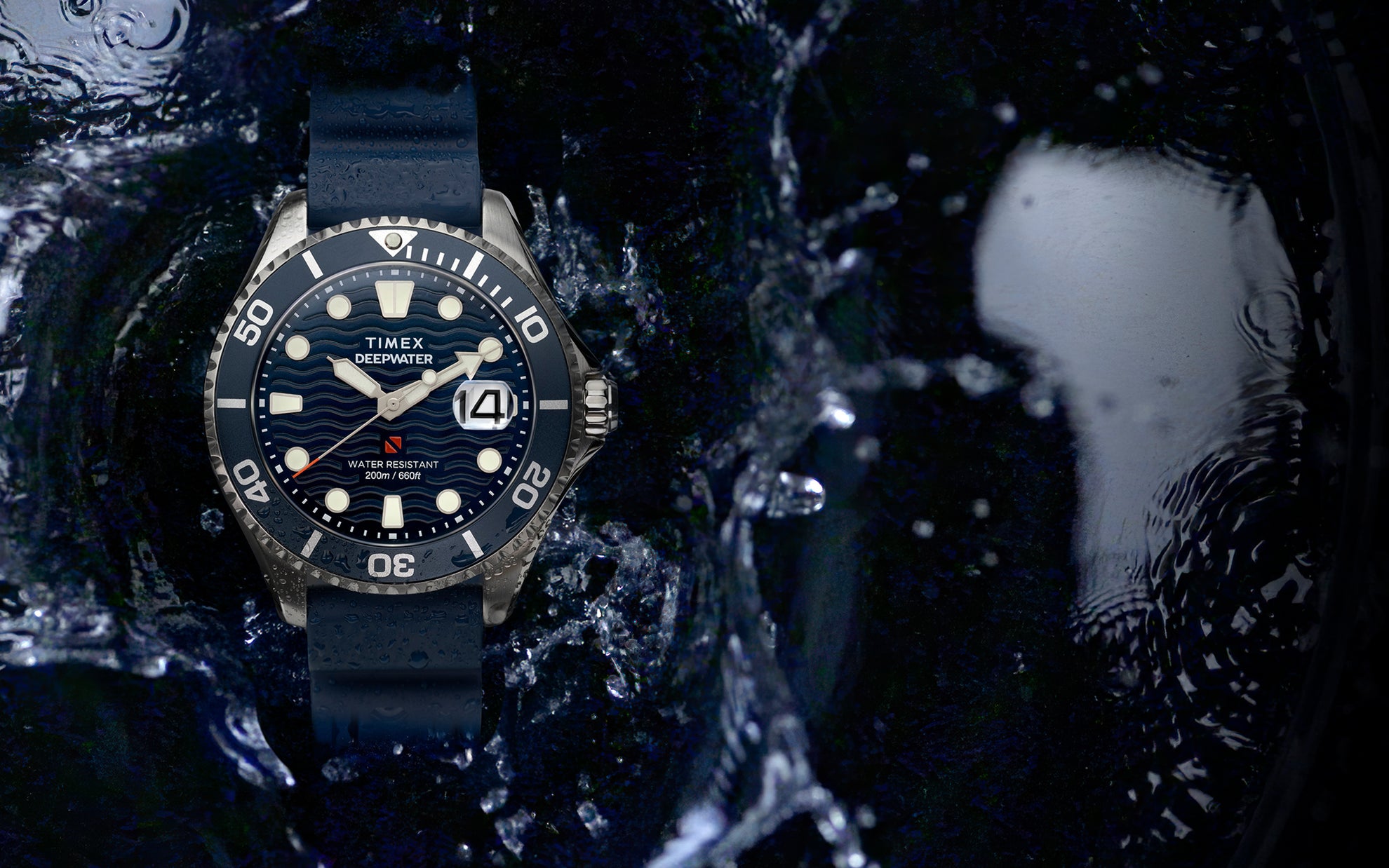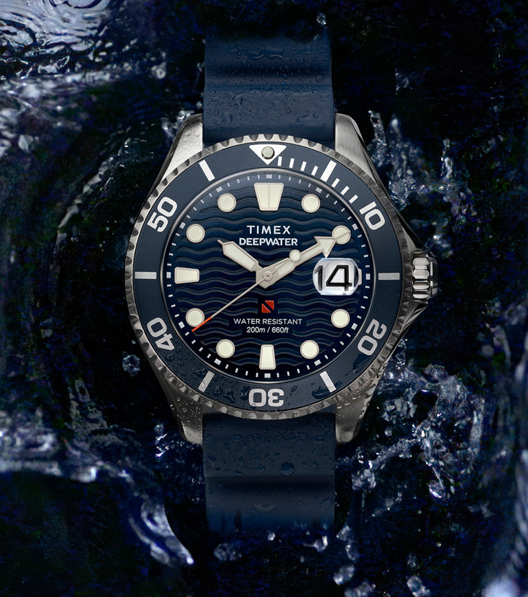 Merging resilience and elegance with crucial functions for underwater pursuits, our Deepwater Meridian 200 is expertly built to venture deeper. A substantial 44mm stainless-steel case, fortified with a screw-down crown and screw-on case back, effectively keeps water out and provides 200m of water resistance. This watch is powered by a reliable quartz movement, and we’ve equipped it with a sapphire crystal with anti-reflective coating, a sturdy crown protector, a magnified date window, a unidirectional ratcheting top ring, and Super-Luminova® hands and hour markers providing the luminosity you rely on as you venture below. A unique wave pattern brings dimension to the blue dial, while a perforated blue synthetic rubber strap ensures durability, comfort, and style both in and out of the water.Specifications
