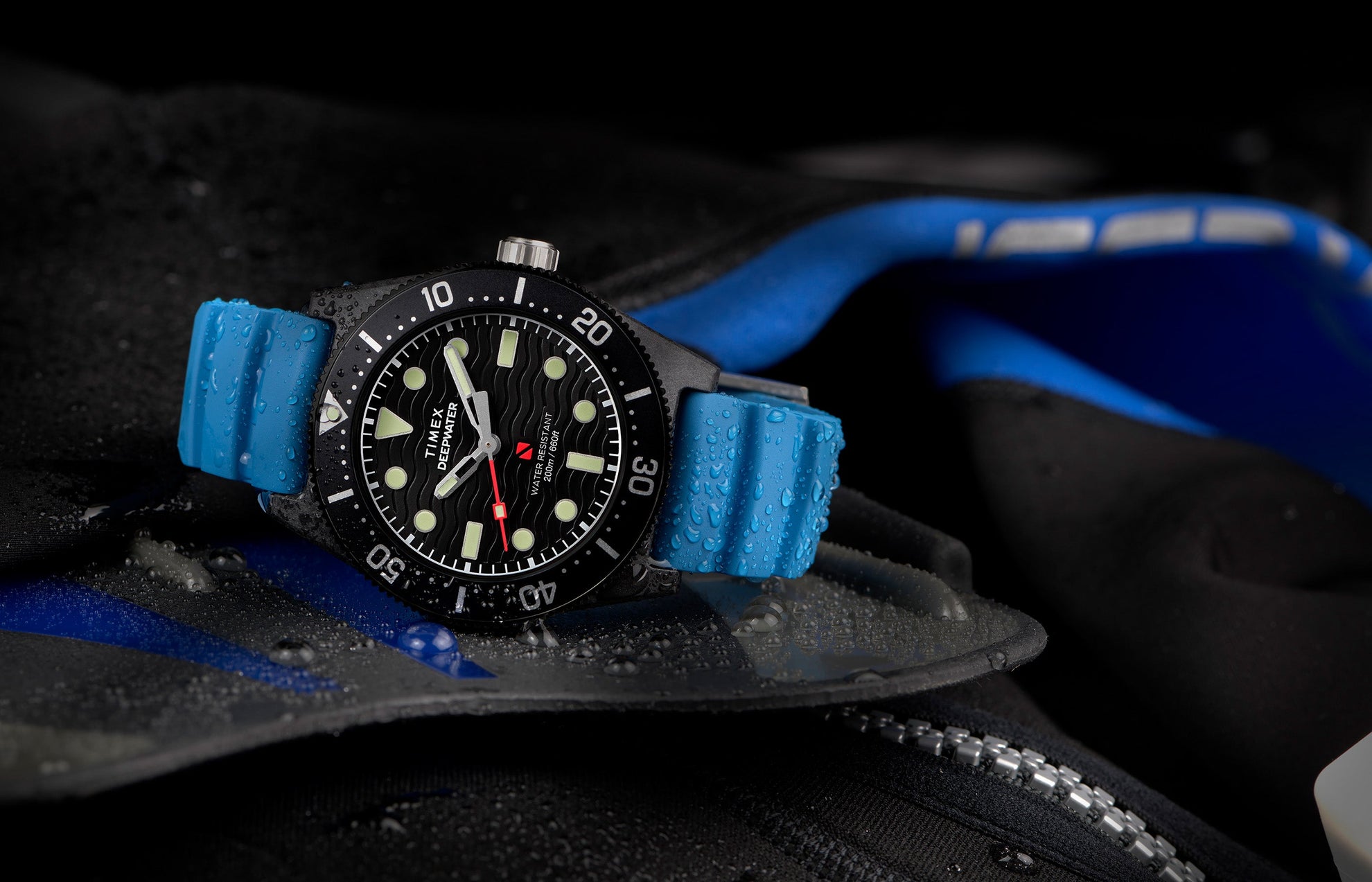 Merging resilience and elegance with crucial functions for underwater pursuits, our Deepwater Reef 200 XCF is expertly built to venture deeper. We’ve updated it with a sturdy 43mm case that’s lighter than aluminum and stronger than traditional resin, made from a tough combination of mixed polycarbonate with extended carbon fibers (XCF). Powering it is a reliable quartz movement, and we’ve equipped it with a sapphire crystal with anti-reflective coating, a unidirectional ratcheting stainless-steel top ring, and Super-Luminova® hands and hour markers providing the luminosity you rely on as you venture below. A unique wave pattern brings dimension to the black dial, while a debossed bright blue synthetic rubber strap ensures durability and style both in and out of the water. With 200m of water resistance reinforced by a screw-down crown, this timepiece is ready to explore beyond the edge.Specifications