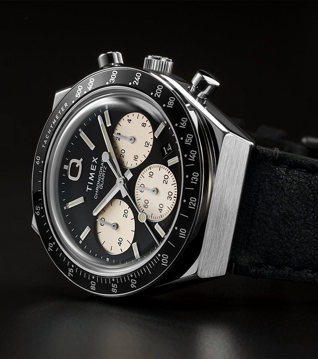 Roar across the finish line with our high-performing Q Timex Chronograph. Inspired by the original motoring watches that graced the tracks of Europe’s most iconic races, this timepiece celebrates the endurance of our legendary 1970s Q Timex. An ultra-precise chronograph movement and black tachymeter bezel recreate the finesse and function of a true racing watch, allowing you to determine elapsed time and average speed like the greatest daredevils in motorsports. Contrasting sub-dials, a date feature, hand-applied dimensional indices, and an updated Q Timex logo smolder against a jet-black dial, while a brushed and polished stainless-steel case and crown bring dynamism and durability to its retro construction. Infinitely wearable, a black leather strap with quick-release spring bars makes for a sporty presentation that’s ready to hit the road whenever you are.
